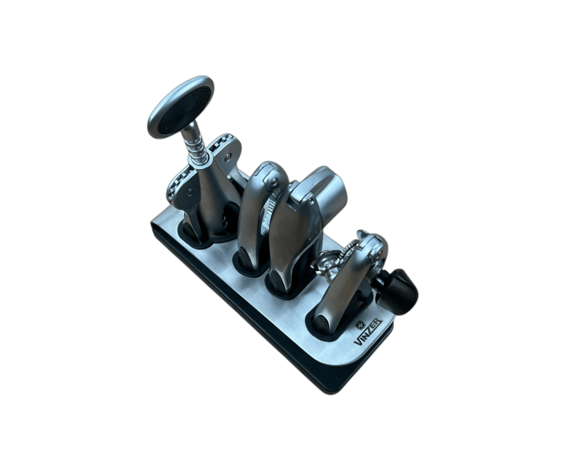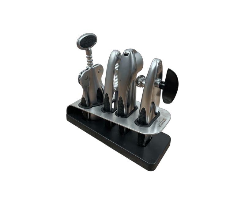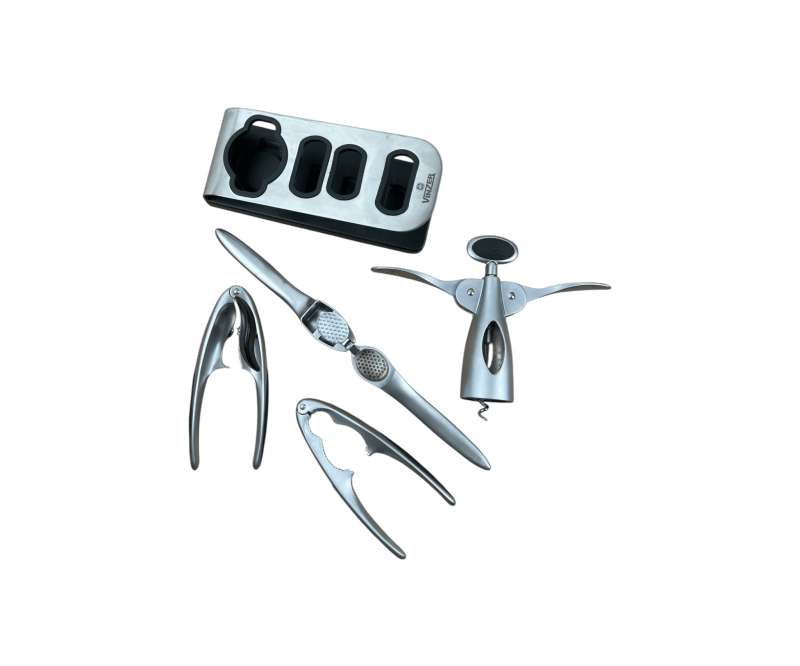 Complete 5-piece set: can opener, nutcracker, bottle opener, garlic press, and a stable holder.